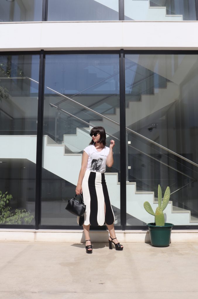 This look was inspired by the iconic David Bowie suit for the Aladdin Sane tour in 1973. The jumpsuit’s black and white stripes and curvy lines can be seen in the skirt I’m wearing and the platform shoes definitely remind us of David Bowie’s. Kansai Yamamoto was the first Japanese designer to have a runway show in London in 1970, which David Bowie attended when he was only 24. The garments from the show were inspired by the Kabuki theatre and Bowie passed that on to his style and performances, where androgyny took part. Because he couldn’t afford the original Kansai Yamamoto designs, he asked friends to create cheaper versions of the clothes.